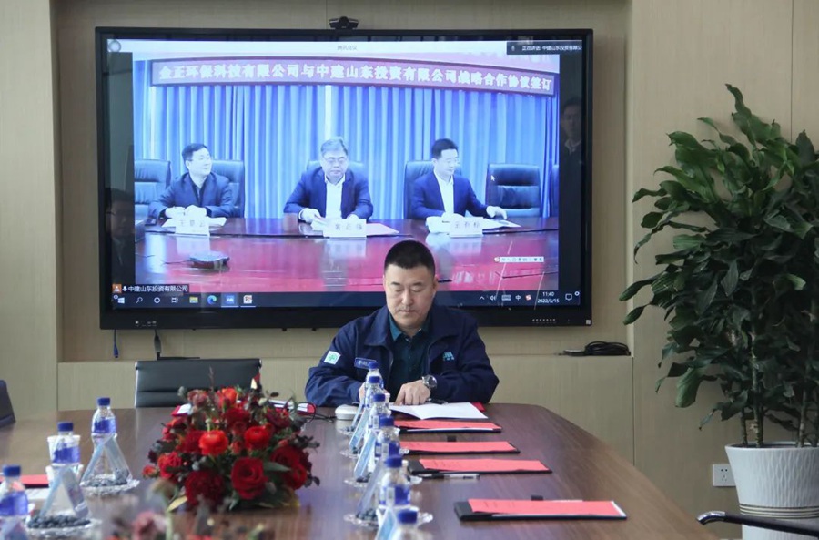 3月15日上午,煙臺(tái)金正環(huán)保科技有限公司(以下簡(jiǎn)稱(chēng)金正環(huán)保)與中建山東投資有限公司(以下簡(jiǎn)稱(chēng)中建山東)在金正環(huán)保產(chǎn)業(yè)園簽訂戰(zhàn)略合作框架協(xié)議。為落實(shí)疫情防控工作要求,此次簽約采取“線(xiàn)上+線(xiàn)下”的方式進(jìn)行,金正環(huán)保為主會(huì)場(chǎng),中建山東董事長(zhǎng)裴正強(qiáng)、總經(jīng)理王有標(biāo)等領(lǐng)導(dǎo)線(xiàn)上連線(xiàn)進(jìn)行,中建山東副總經(jīng)理嚴(yán)強(qiáng)、金正環(huán)保總經(jīng)理李越彪等領(lǐng)導(dǎo)現(xiàn)場(chǎng)出席簽約儀式。
