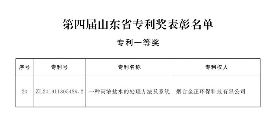 日前,《山東省人民政府關(guān)于第四屆山東省專利獎勵的通報》正式公布,由煙臺金正環(huán)保自主研發(fā)的“一種高濃鹽水的處理方法及系統(tǒng)”(中國發(fā)明專利:ZL201911305489.2),榮獲“第四屆山東省專利獎一等獎”。